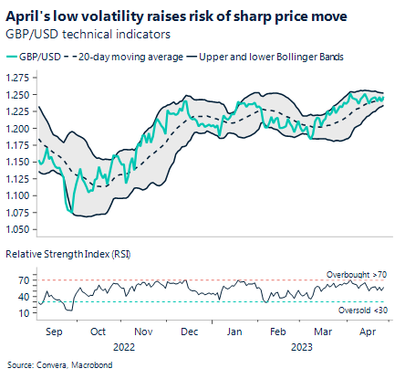 UK CBI data beat forecasts yesterday, hinting at a recovery in UK growth that may keep the Bank of England (BoE) on its current hiking cycle. This supported sterling demand yesterday, but GBP/USD is being largely driven by offshore factors, particularly from the US, which are putting downward pressure on the dollar. BoE rate expectations are moving further above those for the Fed into year-end as well as over the medium-term, which is giving the UK a significant advantage over US rates, proving bullish for GBP/USD. However, should global financial trouble heat up, dovish sounds from BoE policymakers may gain traction, softening the hawkish outlook. With that, it’s hard to pinpoint which direction GBP/USD could breakout from its current narrow trading range. Bollinger Bands are a technical indicator designed to measure volatility as the bands are plotted at a standard deviation level above and below a simple moving average of the price. Exchange rates have a tendency to bounce within the bands’ envelope. But when the bands tighten during a period of low volatility, it raises the likelihood of a sharp price move in either direction.