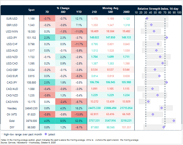 The US dollar index (DXY) has performed well so far this month – up ~0.7% – despite the ongoing U.S. government shutdown. Its largest constituents – the euro (57.6%) and the yen (13.6%) – have each faced political upheavals that sent both currencies lower, boosting the greenback. In Europe, persistent turmoil within the French government has weighed on the common currency, while in Japan, the election of pro-stimulus conservative Sanae Takaichi has raised concerns that the Bank of Japan may delay its recent shift away from ultra-loose monetary policy. Meanwhile, long-term bonds have sold off across the board in response to these developments – echoing the late-summer episode – further supporting the dollar through safe-haven flows.