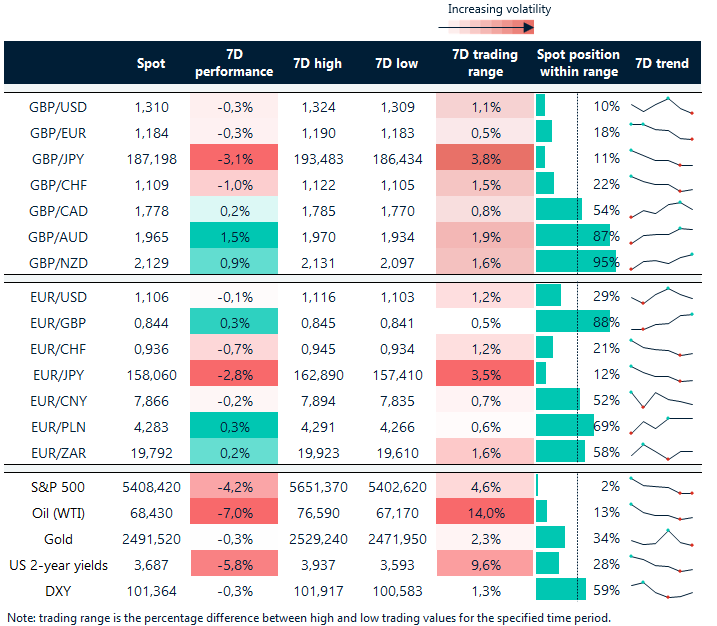 The euro’s momentum remains mildly bullish as the narrowing of the two-year Germany-US yield spread to a 16-month low continues to support the common currency. However, this trend may be tested as early as Thursday, with the ECB’s upcoming rate decision. The central bank is expected to cut rates by 25 basis points, but the primary focus will be on the communication and details of the ECB staff forecasts. Financial markets are currently pricing in one to two additional 25 basis point cuts, assuming a cut next week. Against this backdrop, we see three potential reasons for euro weakness this week: (1) the current pricing offers attractive levels for long positions, with only 60 basis points priced in by year-end, which arguably underestimates the risk premium for potential growth concerns or equity weakness in the coming months; (2) a shift in narrative from inflation to growth concerns could accelerate the rate-cutting cycle; (3) given the strong correlations between USD and EUR rates, risks are skewed towards dovish near-term moves, particularly in response to any soft comments from Lagarde next week.