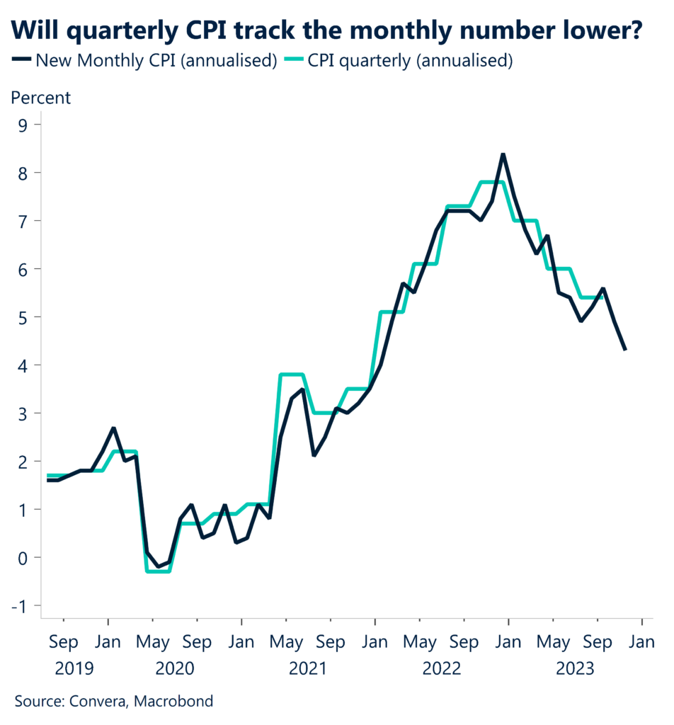 Should this come to pass, annual core (trimmed mean) inflation should decrease to 4.2% y-o-y from 5.2% in Q3, and annual headline inflation would drop to 4.3% y-o-y from 5.4% in Q3.