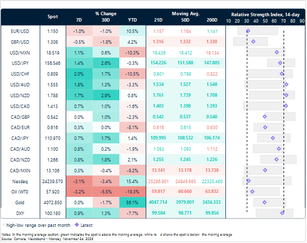 Meanwhile, GBP/USD closed the week ~0.5% lower. Among the majors, the dollar is the one sterling still has the most “catching up” in terms of further depreciation, with the pair remaining 4.6% higher year to date. Yet a bearish setup is gradually taking shape: GBP/USD has only recently slipped below the 200‑day moving average, with the 21‑day crossing beneath the 200‑day, and the 50‑ and 100‑day averages close to following. The Budget could well reinforce this bearish momentum.