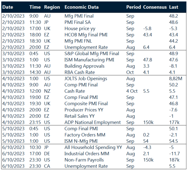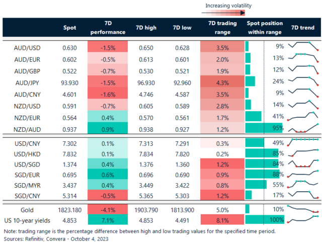 US data continues to run hot with the stronger-than-expected JOLTS report signaling the US Fed will likely keep US rates higher for longer. The US ten-year bond yield hit new 16-year highs while the USD index climbed to new ten-month highs. The Aussie was the hardest hit after a little-changed RBA statement saw rate expectations ease.