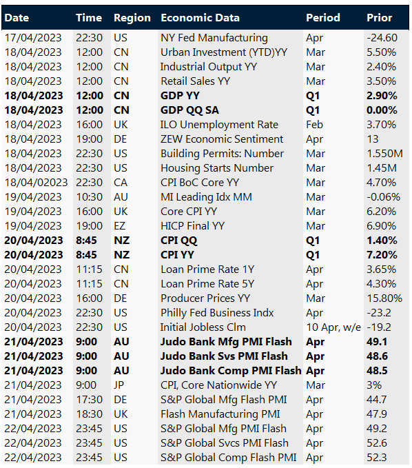 From New Zealand, headline inflation is expected to climb over the March quarter – from 1.4% to 1.7% – while annual inflation is forecast to tick lower from 7.2% to 7.1%.
