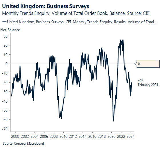The chart below, however, shows UK CBI survey which tends to provide broader perspective across various industries and is almost ticking up higher. The GBP has been higher thanks to sticky inflation despite lackluster GDP.
