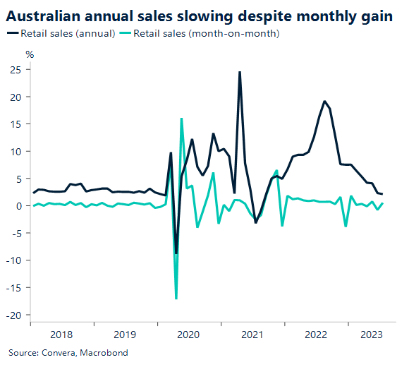While the month-on-month reading was better, this disguises the fact that Australian retail sales is clearly on a long-term trajectory lower. The 2.1% annual rate is the slowest pace of growth since the depths of Covid lockdowns in August 2021.