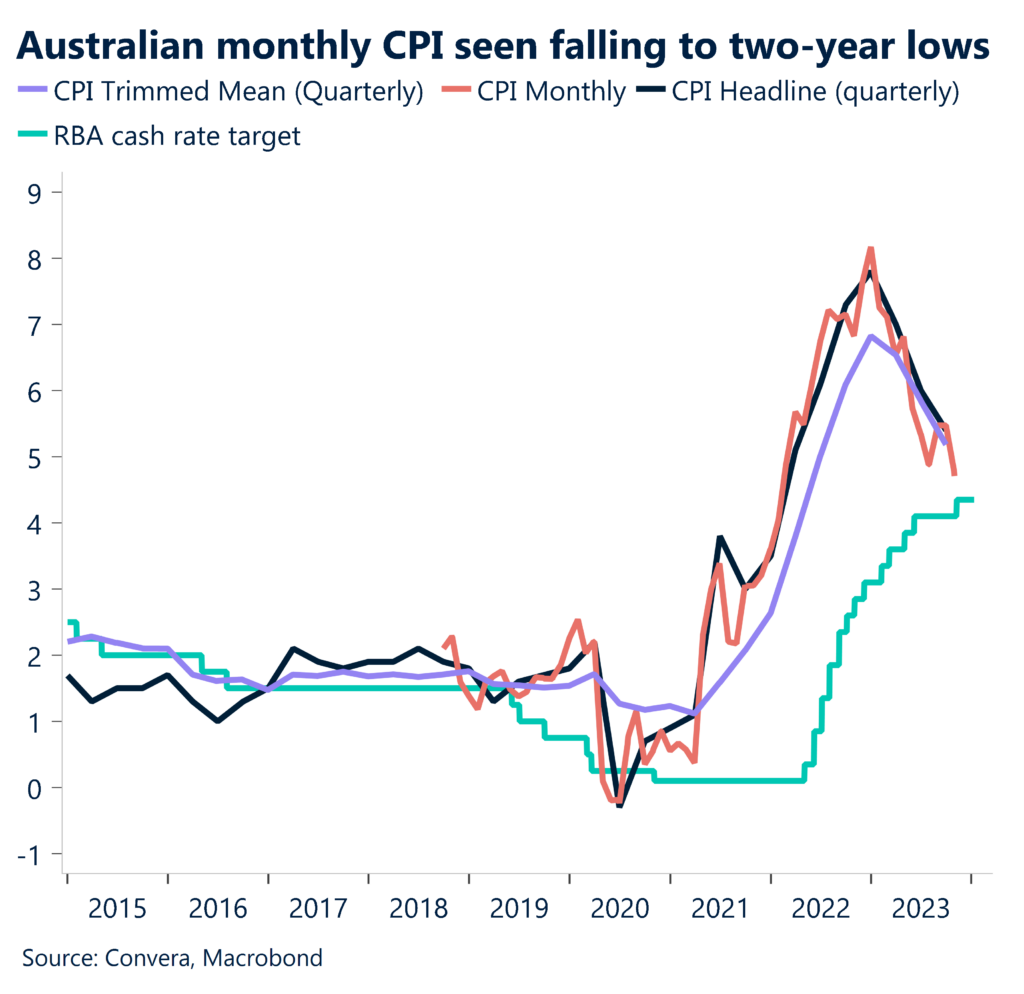 In Australia, inflation is forecast to fall from 4.9% in October to 4.4% in November. If so, this will be the lowest level in almost two years and will make further Reserve Bank of Australia rate hikes less likely.