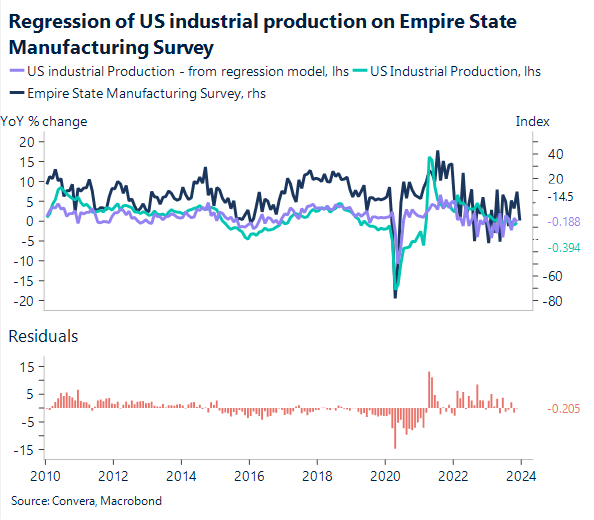The US returns tonight with all eyes on the latest manufacturing data. The Empire State manufacturing survey is forecast to increase by 9.5 points to -5 in January. The survey has been erratic over the last two years, but as tighter lending conditions put pressure on output, we anticipate that it will finally consolidate in contractionary territory. Three months in a row, the new orders index has decreased, which is probably bad news for upcoming output.