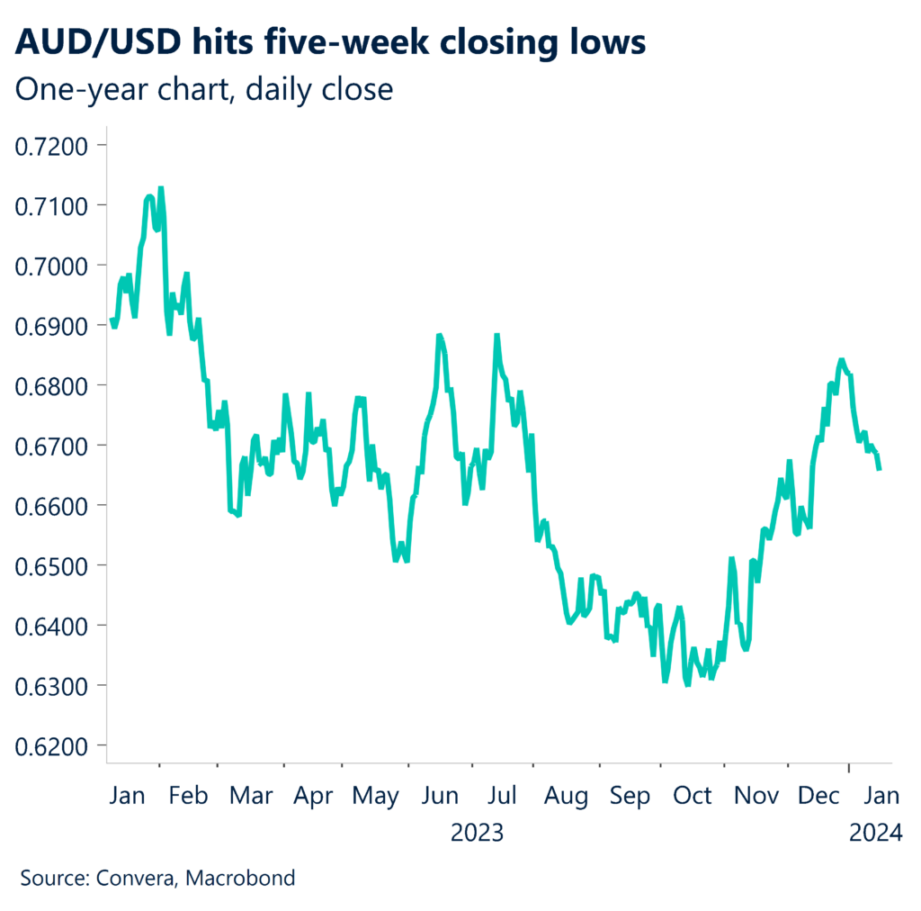 The AUD/USD fell 0.5% as it neared five-week lows.