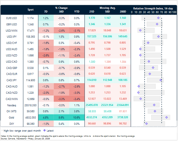 Yesterday the US dollar was broadly offered as markets continued to digest incoming geopolitical developments. EUR/USD remains reluctant to move away from the 1.17 zone, having re-explored it yesterday after finding clear support at the 50‑day moving average near 1.1670. With uncertainty still surrounding events in Greenland, technicals may dominate in the near term before the US-led macro narrative takes clearer shape next week (FOMC policy meeting). 1.1760 capped the upside yesterday. After this week’s mean‑reversion back toward the 21‑day moving average, the line remains the key pivot, making today’s close a clearer test of whether bulls still hold the advantage. A close below the average would simply fold back into the prevailing mean‑reversion pattern.