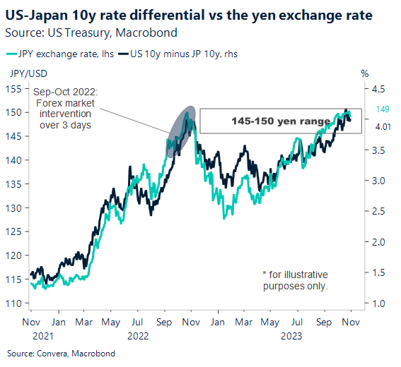 The USD/JPY has again breached key psychological 150 level again and the key risk now is for intervention from the Ministry of Finance (MOF). In an effort to stop the yen’s sell-off, the MoF might step in somewhere between 150 and 155 levels.