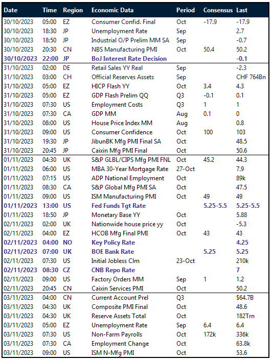 The fall in yields began on Wednesday with the Treasury surprisingly announcing that it needs to borrow slightly less than was expected. What followed was a drop that accelerated after the weaker ADP private jobs report and ISM manufacturing PMI. Yesterday’s rates pause from the Bank of England (BoE), cementing the global peak rate narrative, and a significant downbeat surprise on US unit labor costs (-0.8% vs. 0.7% expected) dragged the yield fall into Thursday. Now, attention turns to the US labour market report. Jobs growth is expected to come in at around 180k for October, after a blockbuster growth of 336k for September. We expect a slight miss of the consensus number.