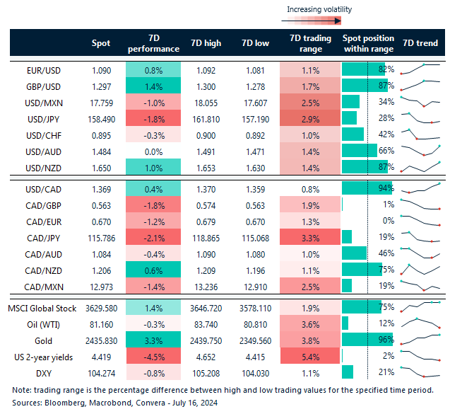 PredictIt odds that Donald Trump wins a second term as president have risen to about 67%, from 60% beforehand, after the assassination attempt on the former president over the weekend. So far the market reaction has been fairly muted, but the yield on 30-year Treasuries surpassed the rate on two-year notes for the first time since January on bets Trump’s policies will spur growth. Markets are grappling with the concept of the “Trump Trade,” which reflects the expectation of a pro-business environment and a significant boost to the US economy through fiscal stimulus, which might limit the scale of rate cuts by the Fed, helping the dollar maintain its high growth and high yield advantage. Nevertheless, we suspect US macro could be a bigger driver of the FX market through the summer. With recent data pointing to easing inflation, a cooling labour market and moderating consumer spending, concerns about an abrupt US slowdown and a more dovish Fed may weigh heavier on the dollar.