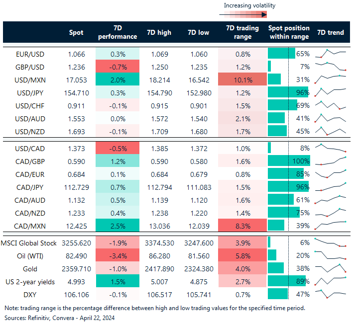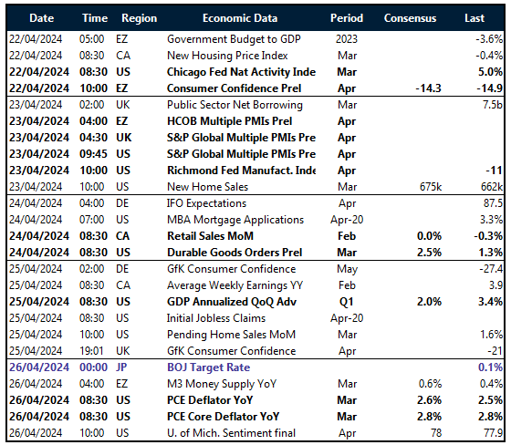 The main risks for the pound are escalating geopolitical tensions jolting world markets, as well as the probability of British policy makers having to cut interest rates earlier than currently priced in by markets (August) given the upside risk to inflation. This week’s flash PMIs will also be in the spotlight as a gauge for UK private sector activity, which has improved over recent months.