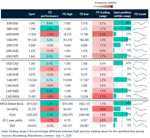 Global currency volatility has continued to drop rapidly as markets await developments on Eurozone and US politics, as well as on the data side. This, along with stimulus measures announced from China, has helped boost cautious risk taking across financial markets, hence the rise in equities and high-beta FX. But today’s pivotal CPI release in the US may also be behind this week’s cautious trading, yet hedging costs in EUR/USD ahead of this data print haven’t been this low since late 2021. EUR/USD overnight volatility is up by as much as 157 basis points to 9.26%; breakeven comes around 50 pips, lower than the implied roll a few days ago. Relatively low hedging costs reflect the fact that markets think Fed officials are more concerned about labour indicators than price pressures for the time being.