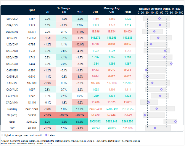 Despite renewed selling pressure on the US Dollar, the CAD has lagged behind its G10 peers, likely weighed down by a soft domestic macro backdrop and WTI prices dipping below $60 a barrel. Looking ahead, next week’s Canadian CPI release will be the final key data point before the Bank of Canada’s rate decision on October 29.
