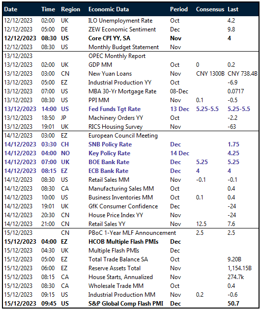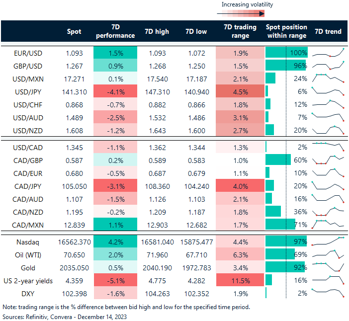 Investors are now expecting the Fed to start cutting interest rates in March with a 70% probability and price in six rate cuts for the next year. Global equities and government bonds rallied together with all three US stock benchmarks rising by well above 1% on the day. The S&P500 inched closer to its all-time high and is now only 2% away from reaching a new record. The US 10-year yield fell below the 4% mark to a 4-month low, pushing down the US dollar against most currencies. USD/JPY is on track to record its fifth consecutive weekly decline, having fallen by 6.4%. The currency pair has acted as the proxy of the monetary policy divergence story with the Feds next move expected to be a cut, while the Bank of Japan is preparing to raise interest rates.