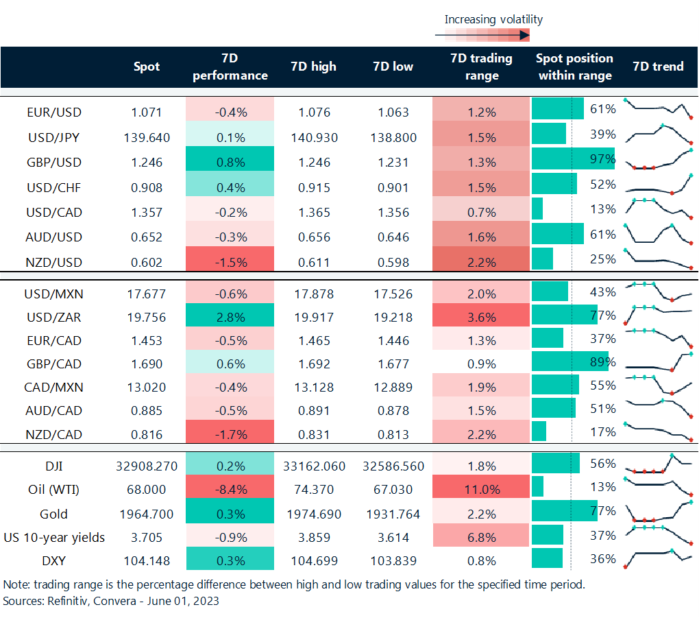 The U.S. dollar started June just below multimonth highs as risk sentiment brightened and the odds of an imminent Fed rate hike receded. Consequently, the euro edged above 10-week lows while the British and Canadian currencies notched one-week peaks. The mood on Wall Street improved early Thursday after the U.S. House approved the deal to suspend the debt ceiling over the next two years. The tentative improvement in risk sentiment tempered safety flows into the greenback, the world’s most liquid currency. The dollar’s recent revival lost thrust after remarks this week from senior Fed officials hinted that the central bank may hold off on raising interest rates in mid-June. The odds of the Fed raising rates by 25 basis points from roughly 5.1% on June 14 fell to about 33% from 70% earlier Wednesday, causing the dollar to surrender some ground. The dollar continues to garner solid underpinning from mounting signs of a resilient U.S. economy that back the view that the Fed isn’t done raising borrowing rates. Next to sway the fluid U.S. rate debate will be America’s May jobs report on Friday and the next consumer inflation survey which lands a day before the next Fed decision.