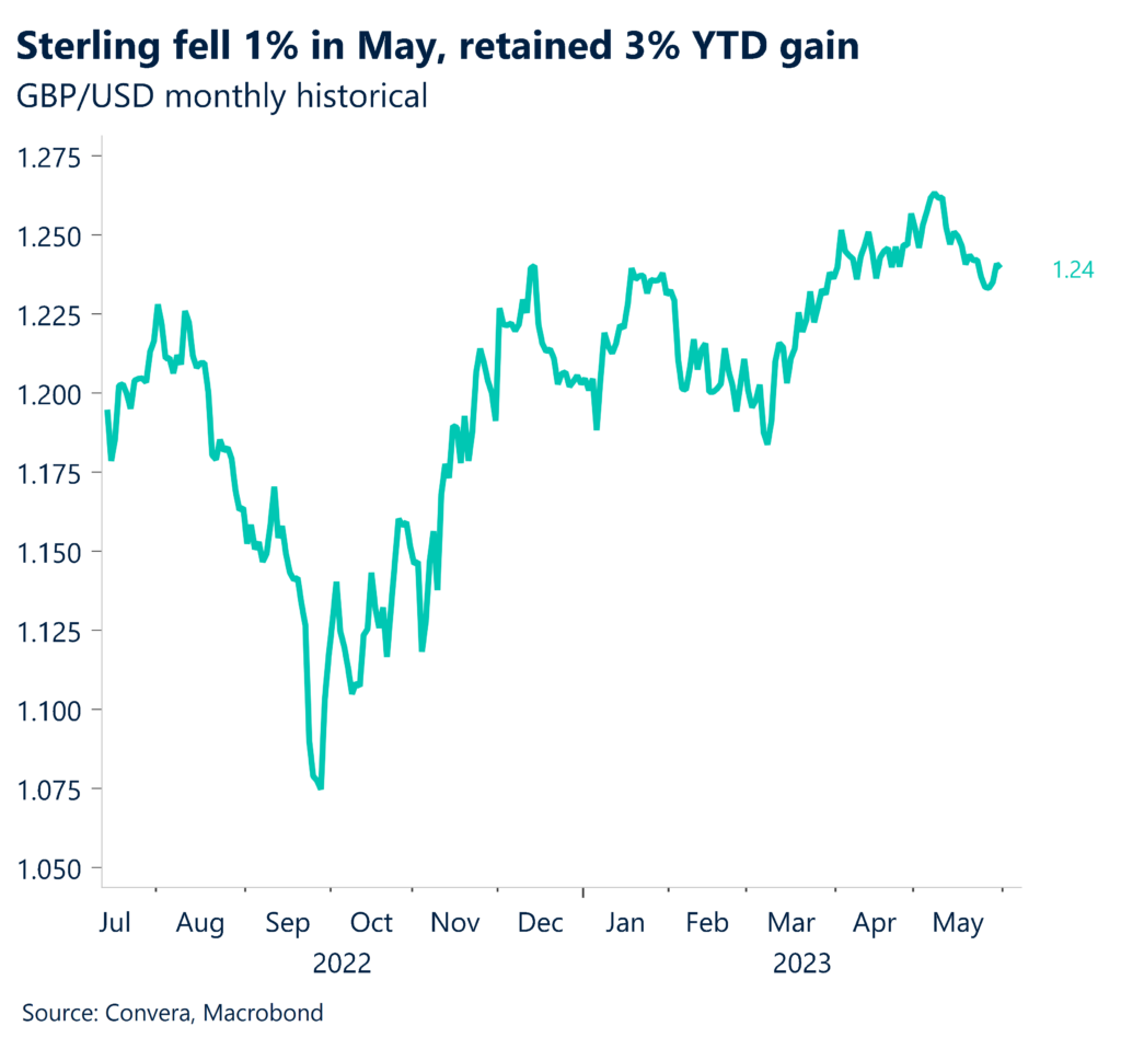 The UK pound kicked off June on its front foot as the greenback pared recent gains and global market sentiment improved. It also helped that UK manufacturing in May was upwardly revised to show a slightly slower pace of contraction. GBP/USD fell 1% in May when it snapped a two-month winning streak. The pound still retains a fair amount of underlying bullishness on the view that U.S. interest rates over the coming year are forecast to fall at a faster pace than the UK, suggesting domestic rates may ultimately peak higher than in the U.S.