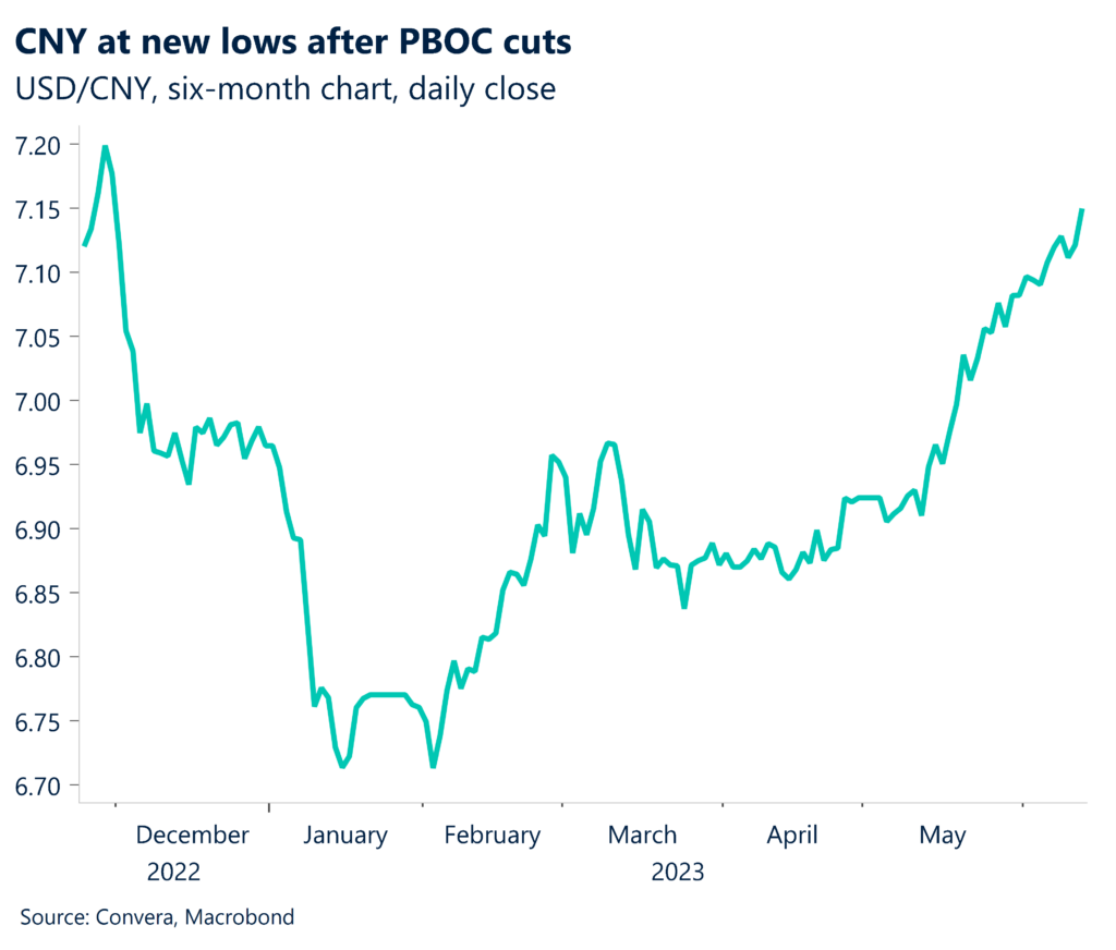 The Chinese yuan bucked the trend, however. A move by the People’s Bank of China to cut two benchmark interest rates – the reverse repo from 2.00% to 1.90% and the overnight standing lending facility from 2.85% to 2.75% — weighed on the CNY.