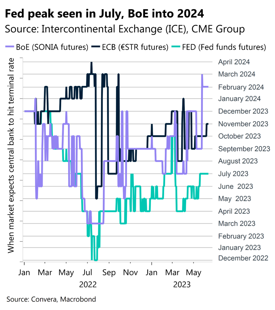 The view on Europe is different – markets see the European Central Bank continuing to tighten until November next year.