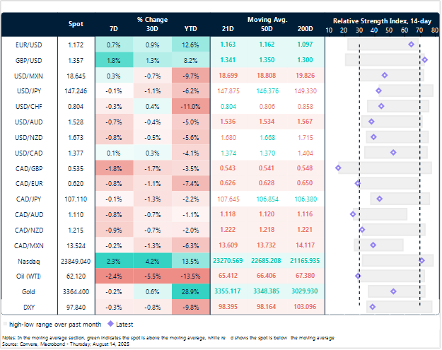 The U.S. dollar’s recent decline is largely fueled by market expectations of a “Fed pivot” in September. Recent benign CPI data and a soft job report for July have shifted sentiment, leading investors to believe the Federal Reserve will adopt a more dovish monetary policy despite concerns around tariff inflation. This prospect of a rate cut has unwound long USD positions across the board, providing a lifeline to the Canadian dollar.