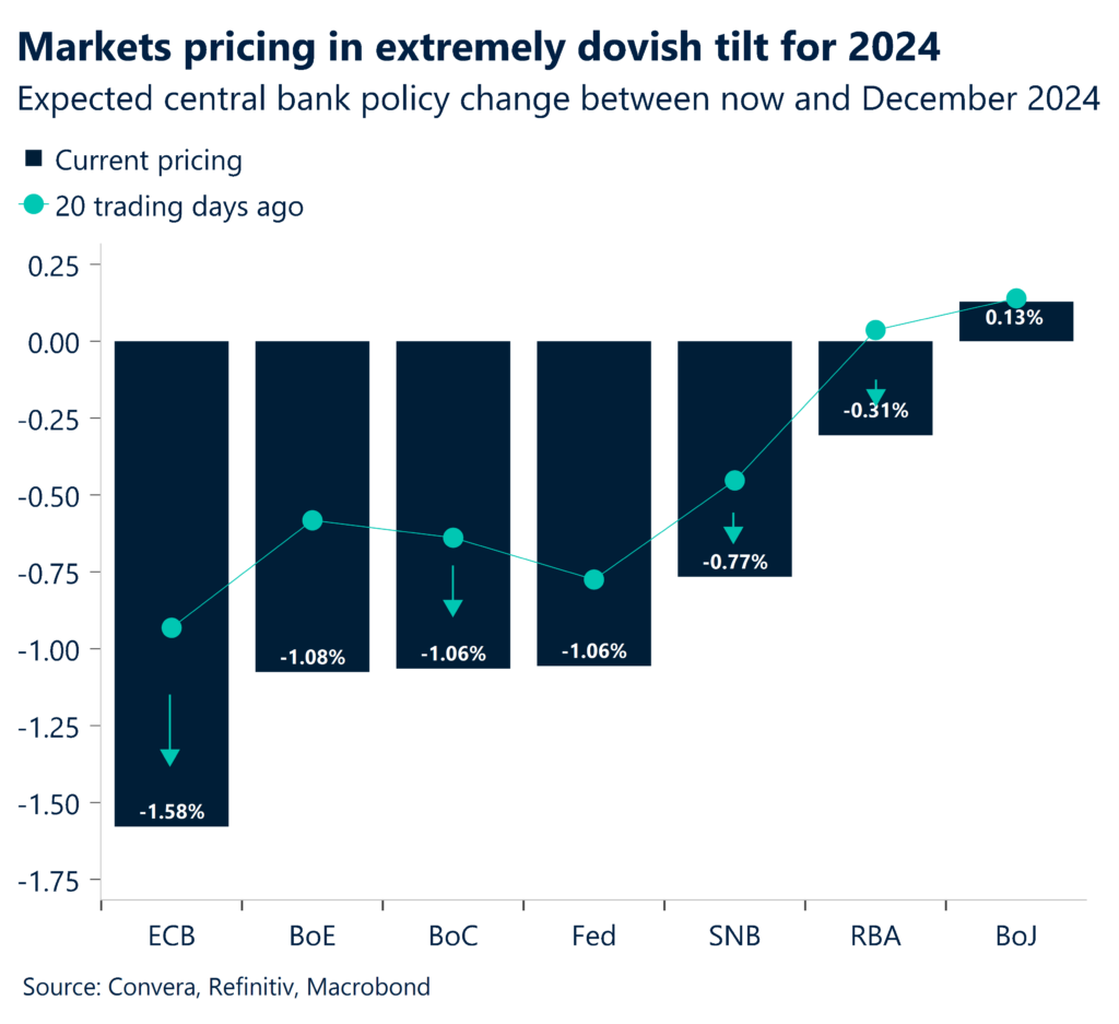 The moves were driven by yesterday’s Federal Reserve decision in which the US central bank kept interest rates on hold between 5.25% and 5.50% but signaled they expected the official rate to fall to 4.50% by the end of 2024.