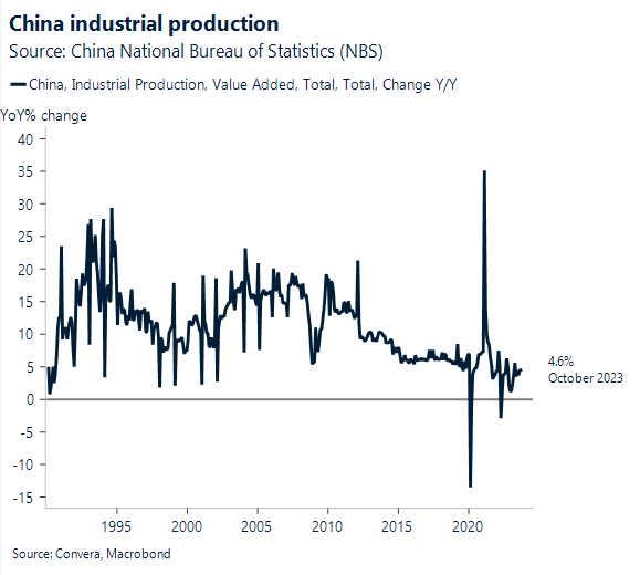 We anticipate that the slowdown in Chinese growth will be helped by base effects, with industrial production (IP) growth, which is expected to increase to 5.5% y-o-y in November from 4.6% in October.