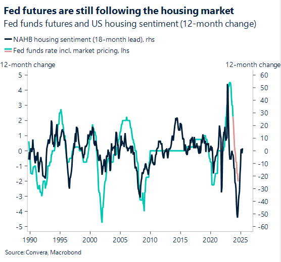 The chart below, however, shows US housing sentiment may have bottomed – and housing sentiment tends to lead Fed Funds Rate by 18 months.
