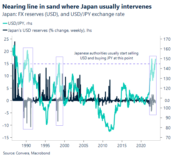 The USDJPY has breached key psychological 150 level and the key risk now is for intervention from the Ministry of Finance (MOF). However, we think that in an effort to stop the yen’s sell-off, we expect that the MoF will step in somewhere between 150 and 155 levels. Next week, all eyes will be on BoJ Interest Rate Decision, JibunBK Mfg PMI Final SA, Monetary Base YY and Unemployment Rate.