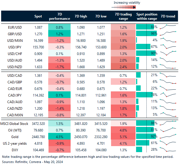 The US dollar fell against its G10 peers last week, with standout losses against pro-cyclicals like NZD (-1.7%) AUD (-1.1%) GBP (-1.1%) and EUR (-0.9). Signs of cooling US inflation and a softening US economy have raised the prospect of Fed rate cuts, hence the fall in US yields across the curve to over 1-month lows.