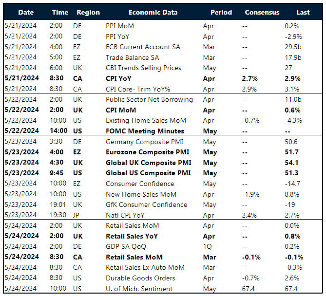 Fed officials have continued reiterating the higher-for-longer mantra against the backdrop of inflation surprising to the upside. However, the overall expectation of inflation eventually coming down to the 2% target remains persistent. Two things will be watched closely when it comes to upcoming Fed speak and the meeting minutes. 1. How is the Fed thinking about immigration and labor productivity as it relates to the labor market and inflation. 2. How is the assumption of goods disinflation continuing to put pressure on headline inflation at risk from a reflating supply chain.