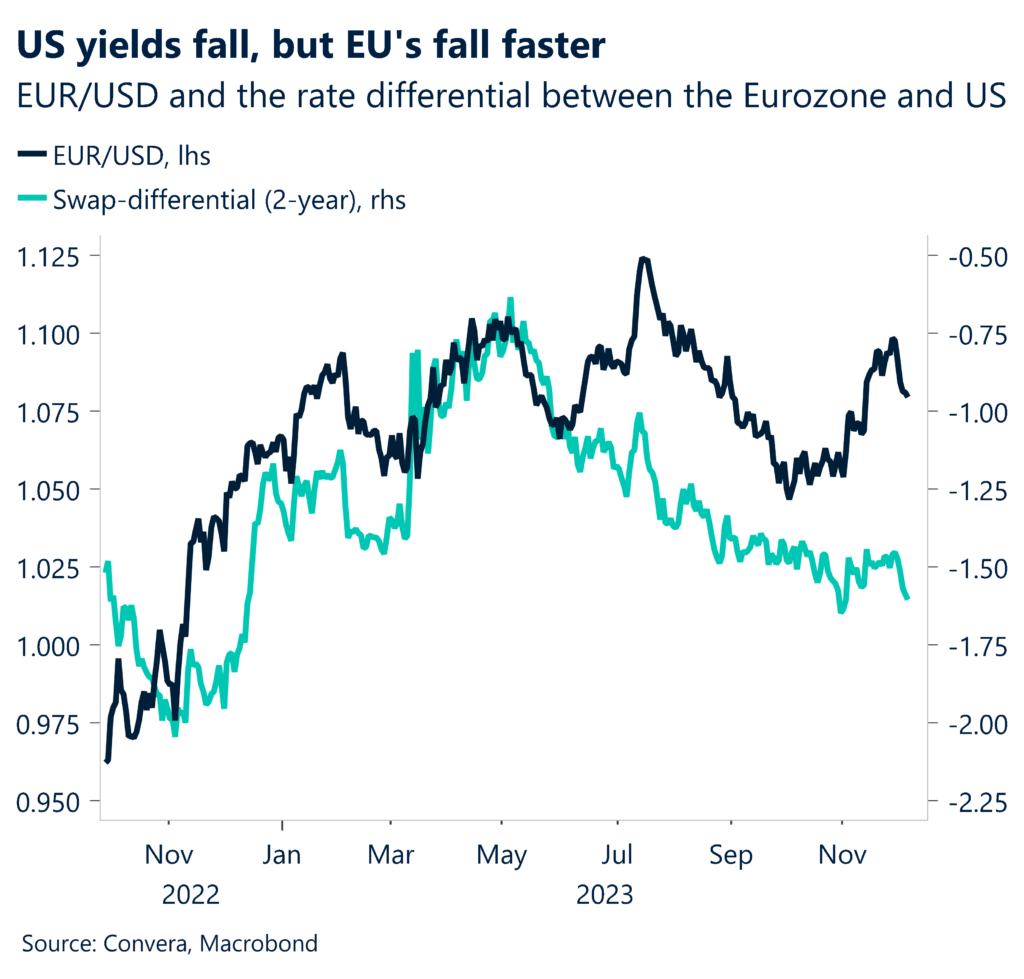 Bond yields in Europe were notably lower overnight as markets price in rate cuts from the European Central Bank. In Europe, most currencies fell with the EUR/USD and GBP/USD down 0.3%.