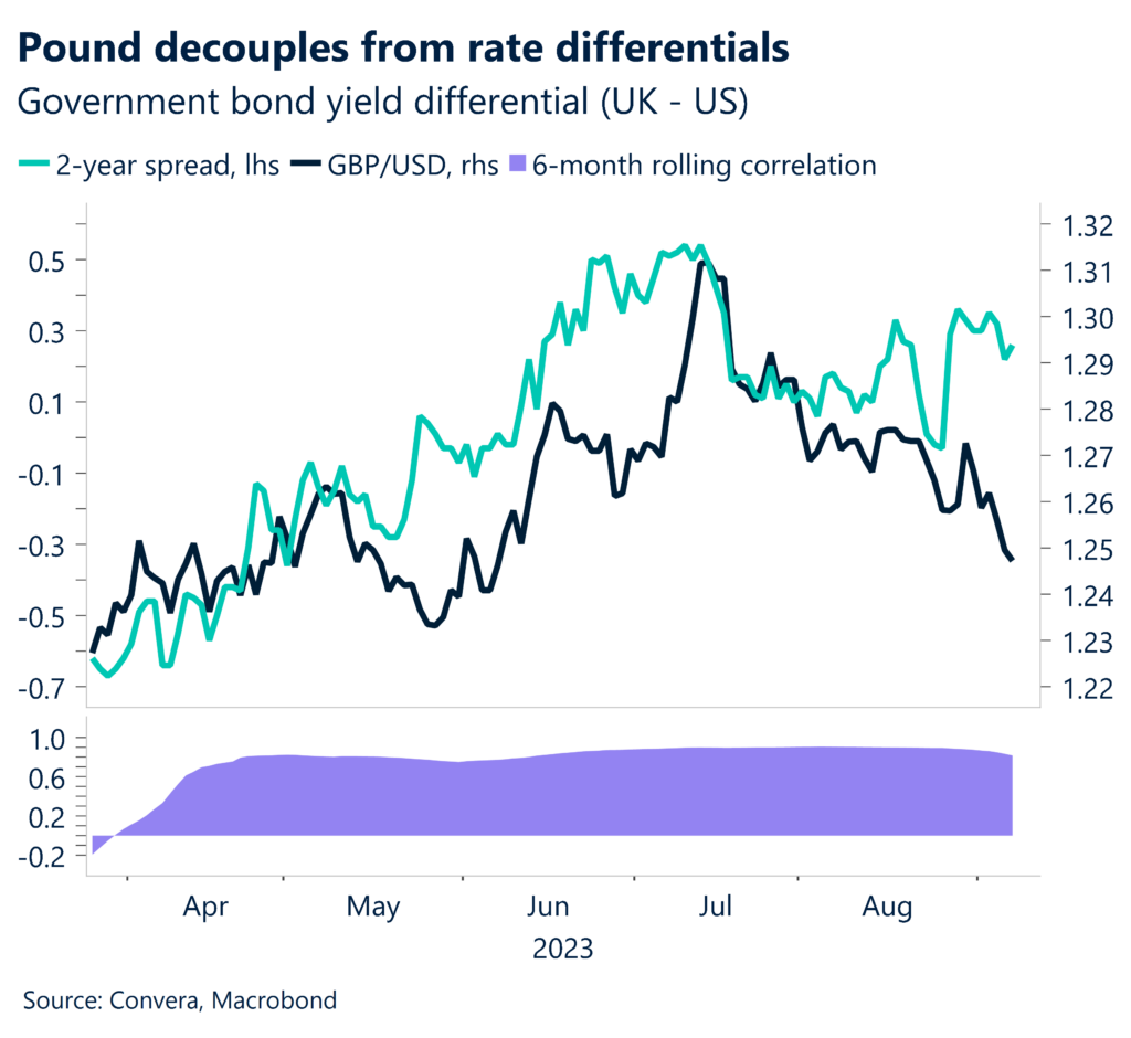 Falling US – and global share prices – suggest that part of the EUR and GBP’s gains in the first half of the year were driven by speculative activity. A further sell-off in markets might see more losses in these currencies.