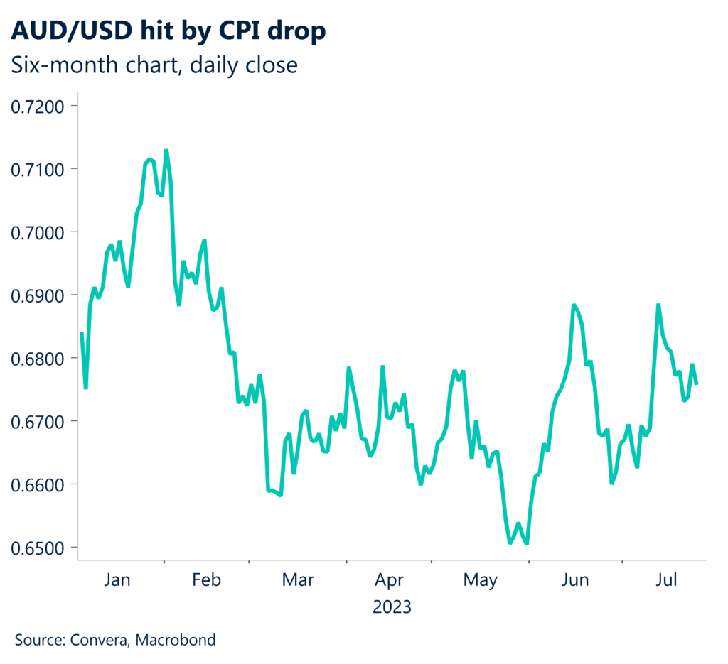 Headline annual inflation fell from 7.0% in the March quarter to 6.0% in the June quarter. The lower inflation reading saw expectations for a Reserve Bank of Australia rate hike next week fall from 55% at the start of the week to 25% after the CPI release