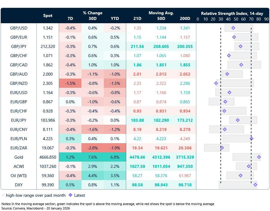 The euro’s move higher comes just as trade tensions flare up again. Trump’s latest tariff threats on European allies — and the EU’s response — echo a pattern we saw repeatedly in 2025: whenever the US rolled out a new tariff plan, the dollar weakened and the euro strengthened. The first half of 2025 made it clear that the euro was the main beneficiary of the “sell America” theme in FX markets. That dynamic still holds today, even though Europe is now the one facing the new round of tariff threats.
