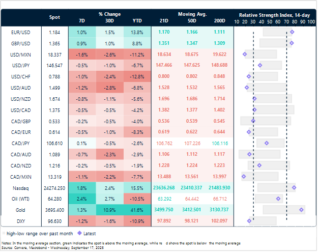 - BoC action: The BoC cuts its policy rate, but the statement is surprisingly “hawkish.” The BoC would likely emphasize the recent CPI volatility and the underlying resilience of the economy, suggesting that this cut is a one-off measure and that the bank is prepared to pause. While this outcome is less likely after the August inflation report, it remains a possibility if the BoC wants to maintain a high degree of flexibility.