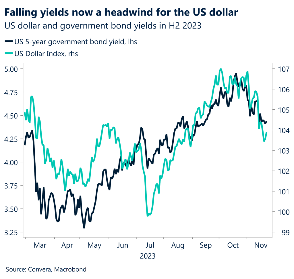 The US dollar continues to be pressured as US bond yields ease on hopes the US Federal Reserve is near the end of its rate-tightening cycle. Tonight, US PMIs are due.