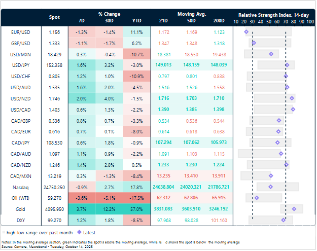 The Loonie has found insufficient relief even after a positive jobs report. Trading at 1.406, the currency remains above its 200-day simple moving average and marks its highest level since April 10 this year. Its struggle is due to a dual headwind: first, the recovering US Dollar, which has been showing bottoming signals for several weeks; and second, the idiosyncratic issues affecting the Euro and Yen that are pulling the entire G10 complex lower. Together, these pressures have fueled a 1.5% month-to-date rise in the US Dollar, a move that persisted despite the recent “tariff tantrum” episode. A lingering question in the FX markets is how long the US Dollar can defy the pressures of a prolonged government shutdown. The Loonie, however, seems destined to remain subdued as long as competing currencies struggle with their domestic challenges and absent data continues to provide a supportive backdrop for the USD.