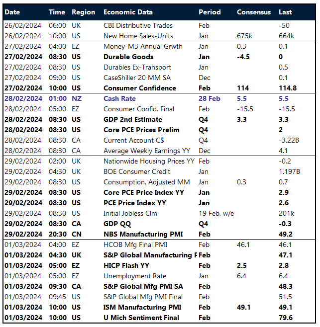 Last week’s two key takeaways were: (1) wages growth in Eurozone remains elevated but is no longer accelerating and (2) the bloc is recovering from the economic slump although continues to lag peers. However, the divergence between Eurozone economies is widening. France experienced the best PMI in nine months, while Germany’s decline accelerated for a fourth successive month, deeper into contraction territory. Friday’s Ifo Business Climate indicator for Germany did improve slightly in February but remains little changed from a three-and-a-half-year low. Meanwhile, the ECB’s meeting minutes confirmed that the central bank is broadly pleased with the current inflationary progress but remains worried about historically strong wages growth and is not ready to declare victory in the war again inflation. With the Spring rate cut off the table, money markets are currently pricing in less than 35% chance of a rate cut in April and three rate cuts throughout the year. We think that there might be further fuel in the tank for the euro to run higher against the dollar as we see further hawkish repricing in ECB rate expectations.