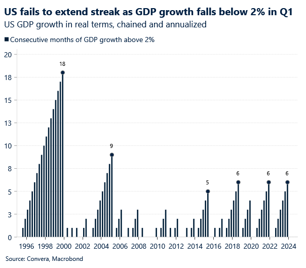 The hard (lagging) data continues to come in strong in the US, as the country closes out the first quarter on a positive note. However, the upside surprises on retail sales, industrial production, inflation, and durable goods did not culminate into a strong GDP print. The US economy failed to extend its positive streak to seven consecutive months of above 2% growth, which would have been the longest in 19 years. Instead, US activity expanded by 1.6% in the three months till March. However, the price component (PCE) came in much hotter than expected, beating the 3.4% estimate with a 3.7% growth rate – the highest since the early 1990s excluding the pandemic years. This confirms our thesis of US exceptionalism having peaked in light of the recent PMI, NFIB and GDP prints and that inflation is stickier than expected.