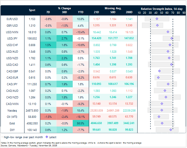 Falling oil prices, however, also feed into broader downside risks tied to disinflationary pressures in the eurozone – an issue that has remained top of mind for the ECB despite its now familiar “we’re in a good place” mantra. Coupled with dampened demand from tariffs, a stronger euro, and weakening wage‑growth pressures (last week’s Q3 y/y figures undershot estimates quite notably), lower oil prices can contribute to softer inflation and, as a result, raise the possibility of further ECB easing, however hard that may be to imagine at present. This scenario poses a downside risk for the euro.