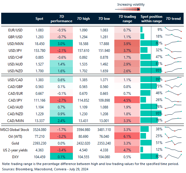A number of softer data releases in recent months have fuelled concerns about an abrupt US slowdown and a more dovish Federal Reserve (Fed). Combined with cross-asset rotations, this has pressured the dollar. However, US data firmed up notably in the last couple of weeks and this Wednesday the Fed should only hint at, rather than pre-commit to, a September cut, even as the market is pricing in fully such an outcome (along with over 2 cuts this year). Moreover, weakening global growth momentum, protectionism/tariff risks and more US fiscal stimulus is constructive for the dollar, whilst the US currency also exhibits seasonal strength in Q3, which could limit any potential losses.