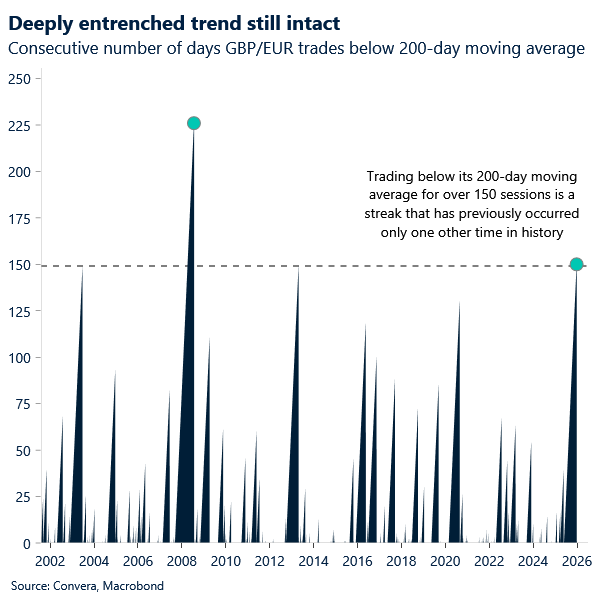 We had flagged that GBP/EUR’s rally looked stretched: the 200‑day moving average remains a clear resistance line, and the failure to break higher leaves the cross vulnerable to renewed downside risks. Sterling’s run below the 200‑day moving average has now passed 150 sessions, a feat matched only once in the historical record. Staying below it for that long shows the market has been consistently unwilling to price a sustained recovery. Moreover, the Relative Strength Index (RSI) hit 70, a level that typically marks overbought territory. Hence, the near‑term pullback is no surprise.