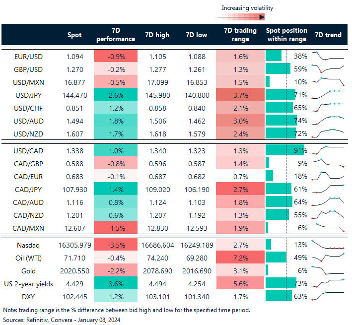 The pound has clearly benefited from this positive divergence with the Eurozone, which is most likely already in a recession. The increased odds of the European Central Bank and Federal Reserve easing monetary policy more than the Bank of England in 2024 have helped GBP/EUR start the week on solid ground, rising by 0.78% in its first week of the year. The currency pair is now trading near €1.1620 and therefore in the upper half of its 3- 6- and 12- month trading ranges. However, it is important to note that GBP/EUR has decoupled from (1) the economic surprise differential and (2) relative interest rate differential with both still pointing to the pair trading below the $1.1550 level.