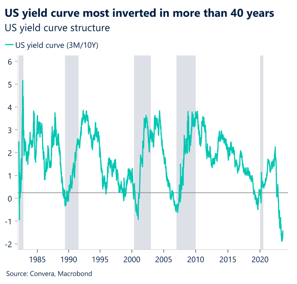 The move in US bond yields continues to drive an inversion of the yield curve with the US three-month / 10-year curve at the steepest inversion in over 40 years. Historically, this type of inversion has signaled a US recession, but the US economy has remained resilient this time – so far.