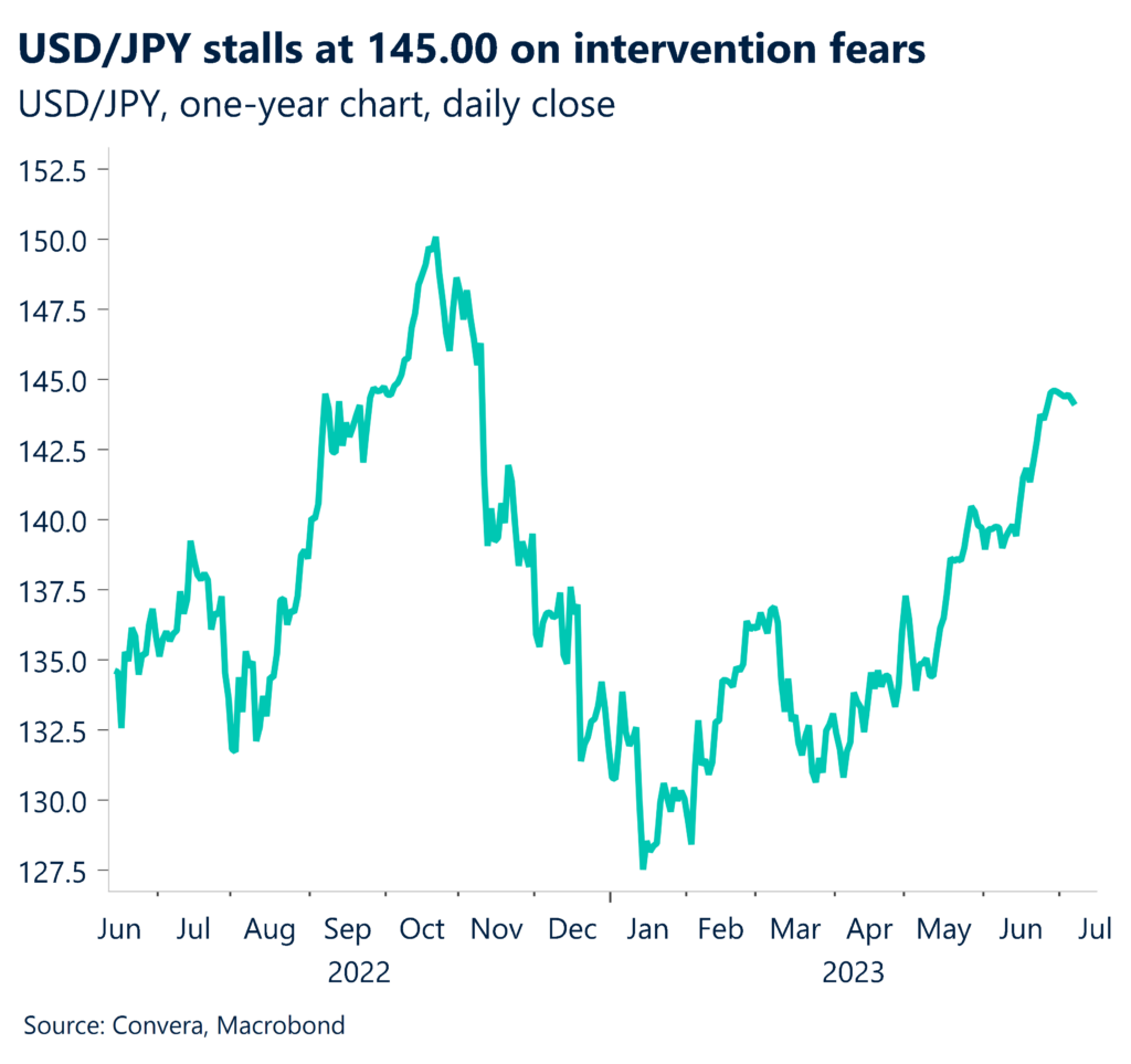 The USD/JPY turned sharply lower from the key 145.00 level that has been identified as a potential level for intervention by Japan’s Ministry of Finance. The MoF intervened at 145.00 in September last year to contain JPY weakness.