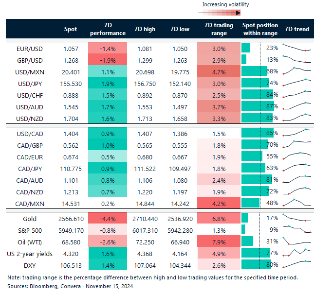 The dollar’s acceleration this week emerged after President-elect Donald Trump’s hawkish cabinet picks and the Republicans maintaining control of the House, delivering Trump a trifecta and raising the scope of pushing his agenda. Economic momentum had already shifted back in favour of the US, motivating yet another hawkish repricing of the Fed’s cutting cycle, which is dollar positive, both via tariff and fiscal-monetary policy mix channels. Though Trump’s policies and expectations for sustained US growth into 2025 should further overwhelm seasonal dollar weakness into year end, uncertainty remains high, and the key takeaway is that it is now all about the scale and speed of policy shift.