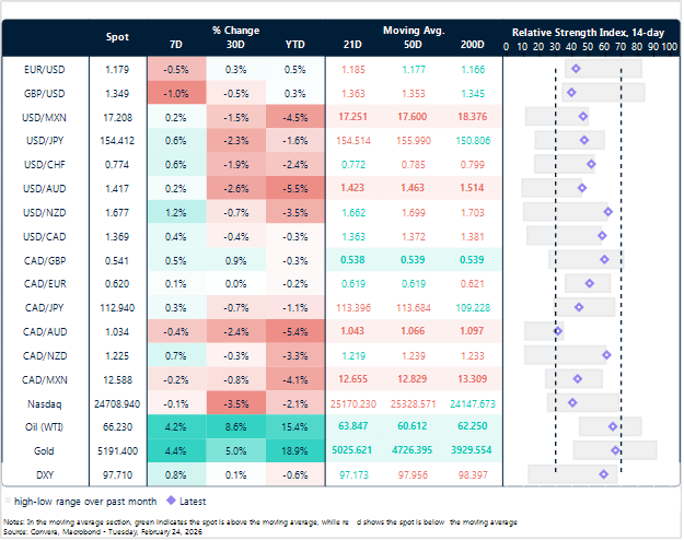 The US dollar Index has seen some notable swings lately as it navigates a tug of war between prospects of decent growth and sticky inflation and shifting trade policies. While the index recently touched 98.1 before settling back near 97.7, it remains resilient despite a spike in market volatility. This stability comes as the administration pivots from the now struck down IEEPA tariffs to new 15% levies under Section 122. Although these new measures act as a momentarily bridge, the shift has brought back trade policy uncertainty. While the effective tariff rate is currently close to where it stood last week, the lack of long-term clarity on future trade barriers continues to weigh on the broader dollar narrative.