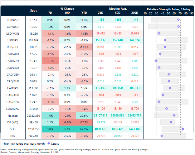 Markets continue to price around 60bps of Fed easing by June 2026, but the trajectory could shift if upcoming data leans soft and Hassett is confirmed as chair. A dovish Fed outlook would stand in sharper contrast to peers, especially if the BoJ tightens later this month, adding further pressure on the dollar. For now, investors are hedging against policy uncertainty and bracing for the final stretch of US data before the Fed’s December meeting.