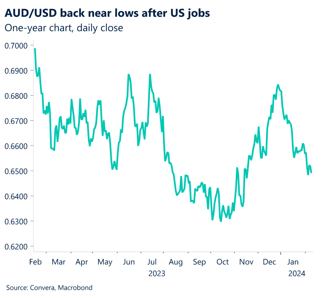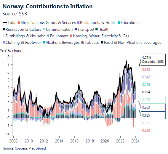 Traditionally seen as a benchmark for open, exposed economics, we’re looking for a further fall in Norway’s CPI-ATE (underlying inflation) from 5.5% to 5.3% and a decline in Norwegian headline CPI inflation from 4.8% in December to 4.6% in January.